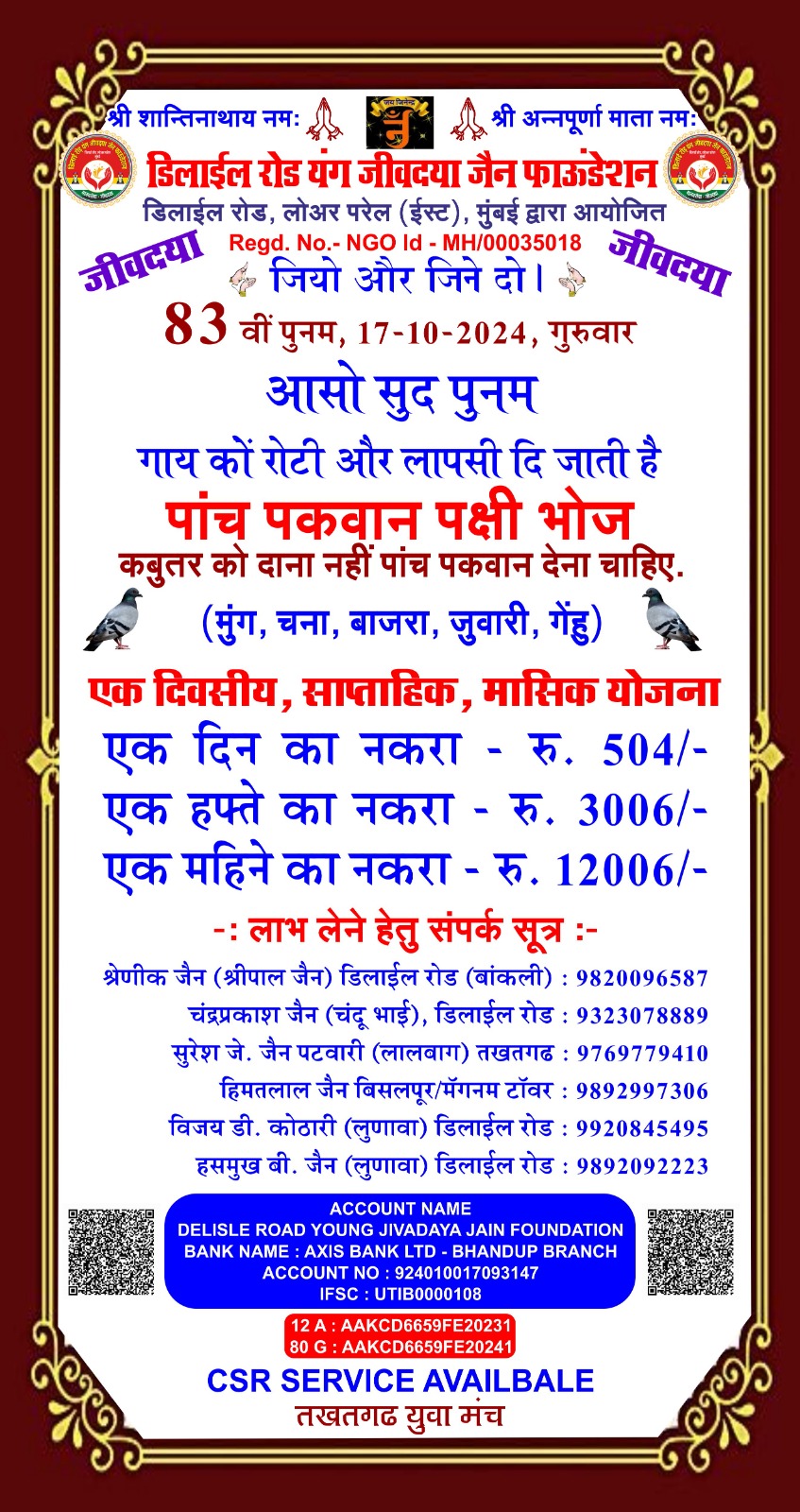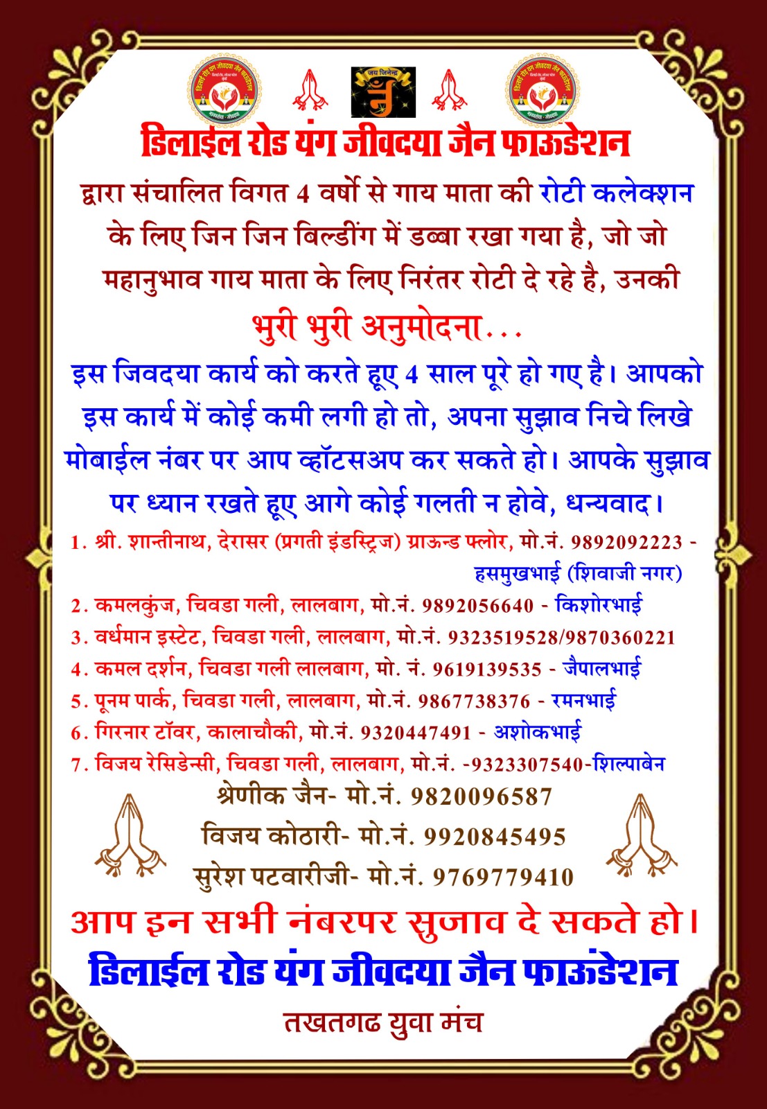 डिलाई रोड यंग जीव दया जैन फाउंडेशन और तखतगढ़ युवा मंच द्वारा संचालित जीव दया का काम 15 अगस्त 2016 से नियमित रूप से हो रहा है एवं कोरोना काल दो 20 मार्च 2019 से 15 अगस्त 2021 तक हमने 1000 लोगों के लिए सुबह दोपहर शाम चाय पानी नाश्ता एवं खाने की व्यवस्था करते रहे है एवं जरूरतमंदों ब्लाइंड हैंडिकैप्ड एवं गरीबों को खाने के किट उपलब्ध करवाते रहे हैं आज भी हमारे पास 4500 हजार ब्लाइंड्स हैंडिकैप्ड संपर्क में है इन लोगो को हर 3 महीने में खाने के कीट (राशन सामग्री) उपलब्ध करवाते रहे हैं वर्तमान में हम हर 6 माह में एक बार 50 ब्लाइंड एवं हैंडीकैप्ड लोगों को राशन की सामग्री उपलब्ध करवा रहे हैं कोरोना काल में हमारे एरिया डिलाई रोड जीव दया यंग ग्रुप में ग्रुप 7 से 8 वर्षीतप वाले थे जिनको सवेरे नारियल पानी एवं मिठाई उपलब्ध करवाते रहे हैं