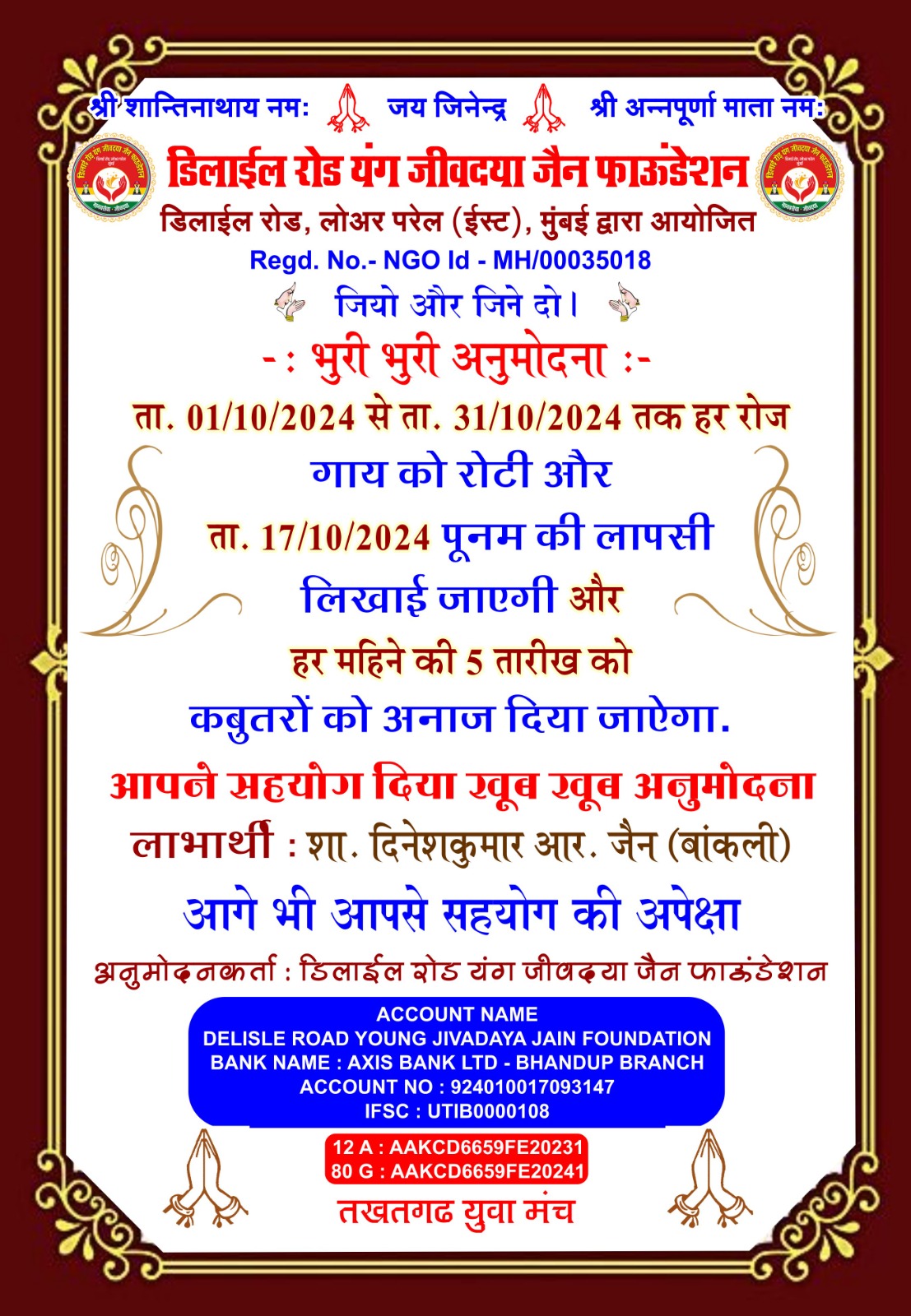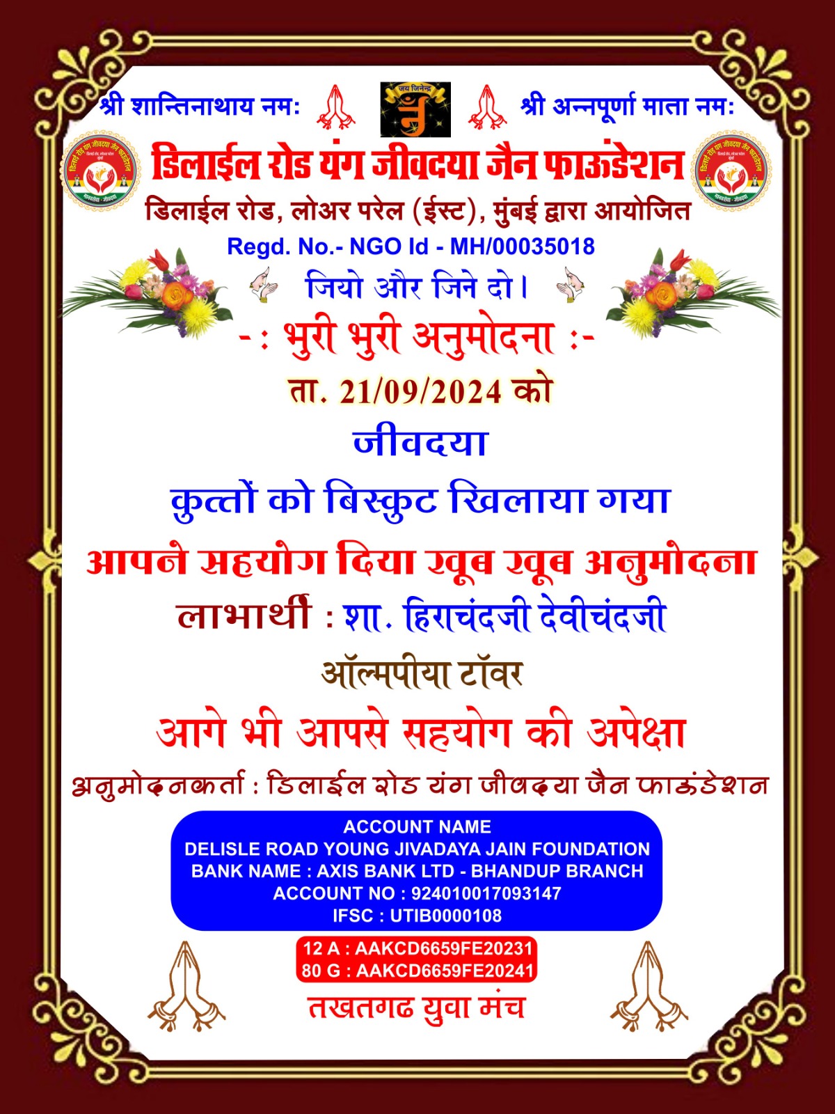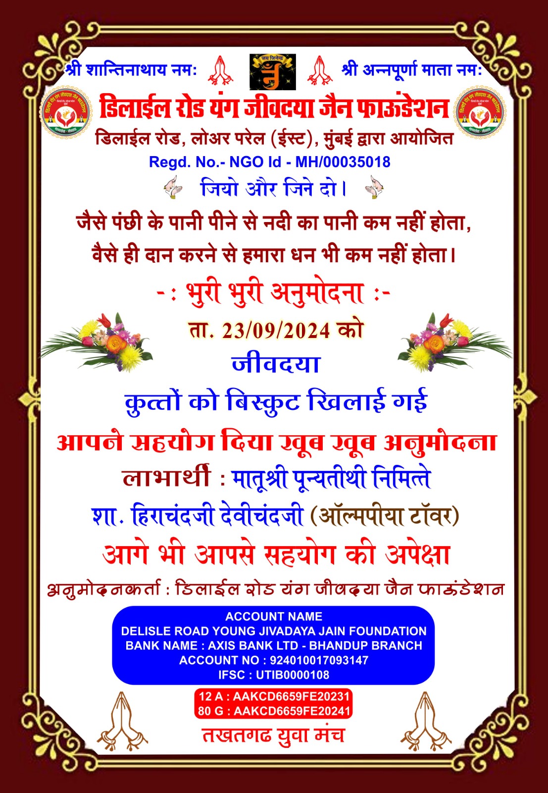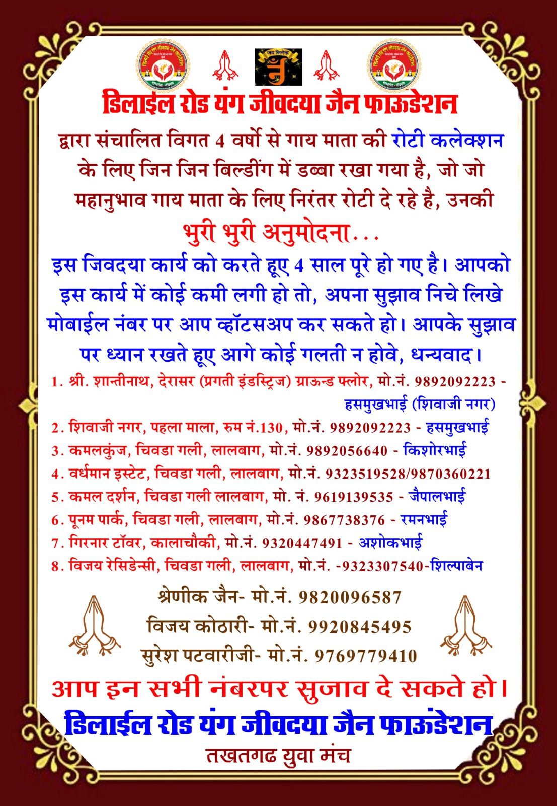 डिलाई रोड यंग जीव दया जैन फाउंडेशन और तखतगढ़ युवा मंच द्वारा संचालित जीव दया का काम 15 अगस्त 2016 से नियमित रूप से हो रहा है एवं कोरोना काल दो 20 मार्च 2019 से 15 अगस्त 2021 तक हमने 1000 लोगों के लिए सुबह दोपहर शाम चाय पानी नाश्ता एवं खाने की व्यवस्था करते रहे है एवं जरूरतमंदों ब्लाइंड हैंडिकैप्ड एवं गरीबों को खाने के किट उपलब्ध करवाते रहे हैं आज भी हमारे पास 4500 हजार ब्लाइंड्स हैंडिकैप्ड संपर्क में है इन लोगो को हर 3 महीने में खाने के कीट (राशन सामग्री) उपलब्ध करवाते रहे हैं वर्तमान में हम हर 6 माह में एक बार 50 ब्लाइंड एवं हैंडीकैप्ड लोगों को राशन की सामग्री उपलब्ध करवा रहे हैं कोरोना काल में हमारे एरिया डिलाई रोड जीव दया यंग ग्रुप में ग्रुप 7 से 8 वर्षीतप वाले थे जिनको सवेरे नारियल पानी एवं मिठाई उपलब्ध करवाते रहे हैं