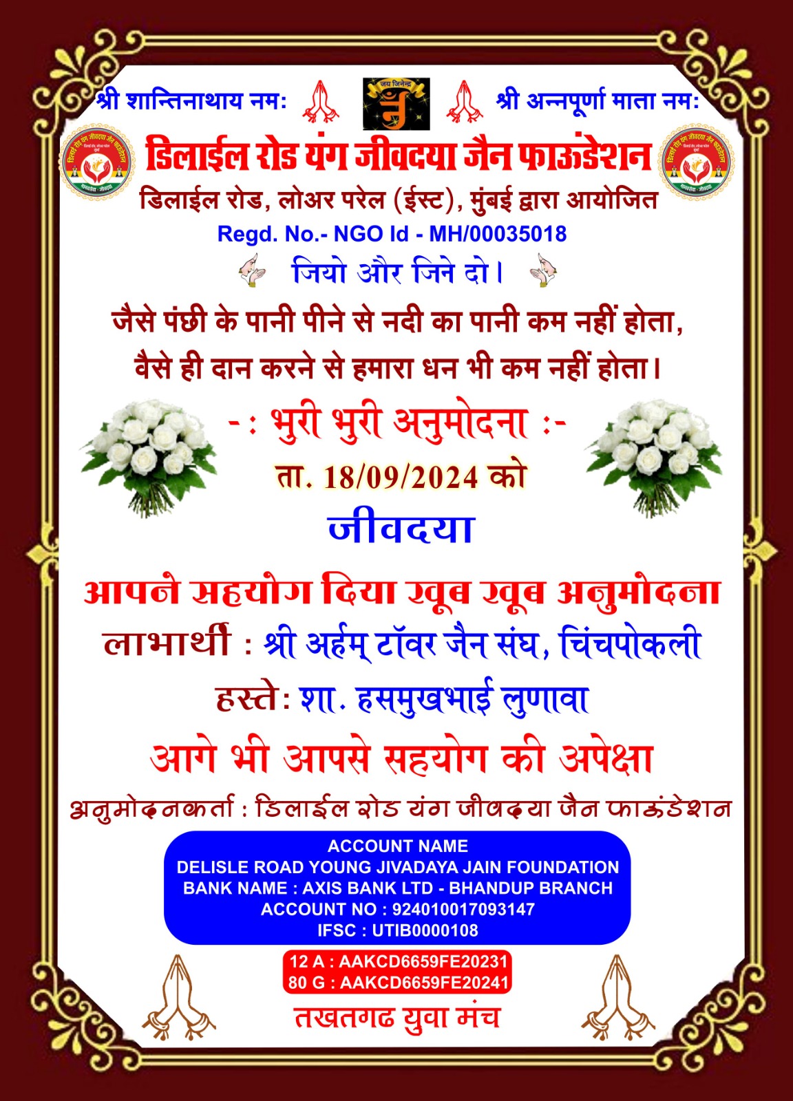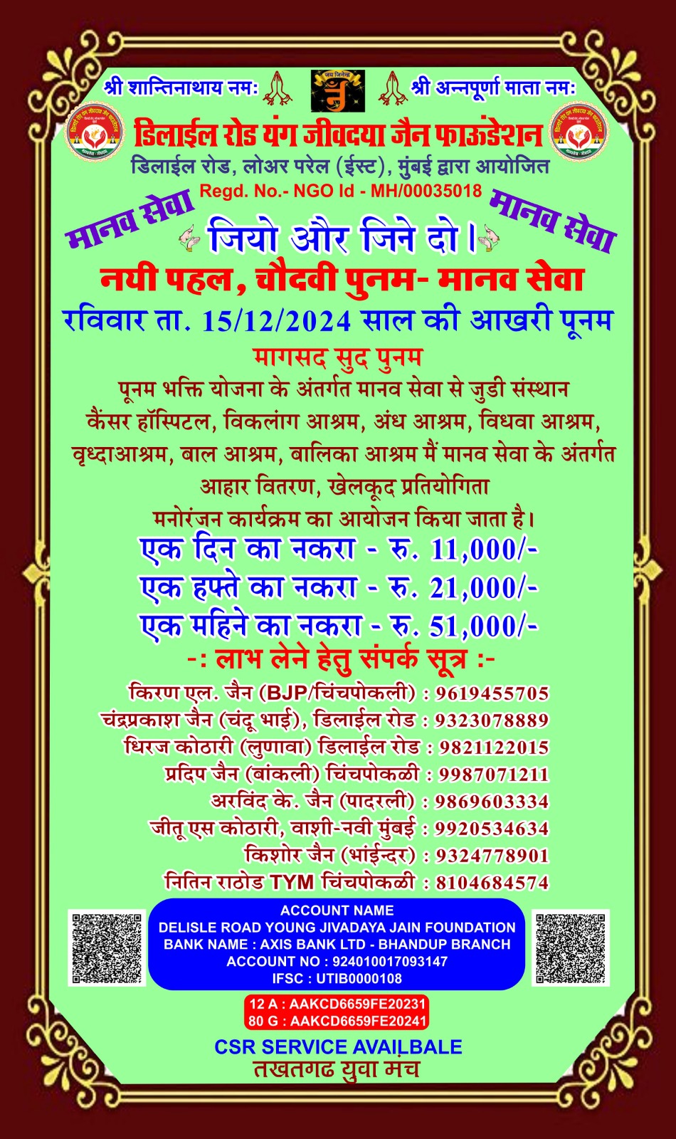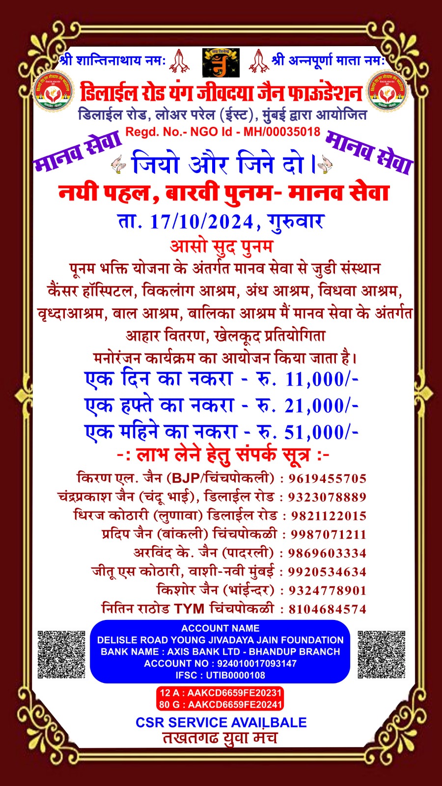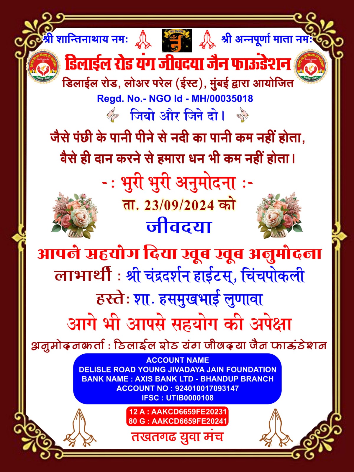 डिलाई रोड यंग जीव दया जैन फाउंडेशन और तखतगढ़ युवा मंच द्वारा संचालित जीव दया का काम 15 अगस्त 2016 से नियमित रूप से हो रहा है एवं कोरोना काल दो 20 मार्च 2019 से 15 अगस्त 2021 तक हमने 1000 लोगों के लिए सुबह दोपहर शाम चाय पानी नाश्ता एवं खाने की व्यवस्था करते रहे है एवं जरूरतमंदों ब्लाइंड हैंडिकैप्ड एवं गरीबों को खाने के किट उपलब्ध करवाते रहे हैं आज भी हमारे पास 4500 हजार ब्लाइंड्स हैंडिकैप्ड संपर्क में है इन लोगो को हर 3 महीने में खाने के कीट (राशन सामग्री) उपलब्ध करवाते रहे हैं वर्तमान में हम हर 6 माह में एक बार 50 ब्लाइंड एवं हैंडीकैप्ड लोगों को राशन की सामग्री उपलब्ध करवा रहे हैं कोरोना काल में हमारे एरिया डिलाई रोड जीव दया यंग ग्रुप में ग्रुप 7 से 8 वर्षीतप वाले थे जिनको सवेरे नारियल पानी एवं मिठाई उपलब्ध करवाते रहे हैं