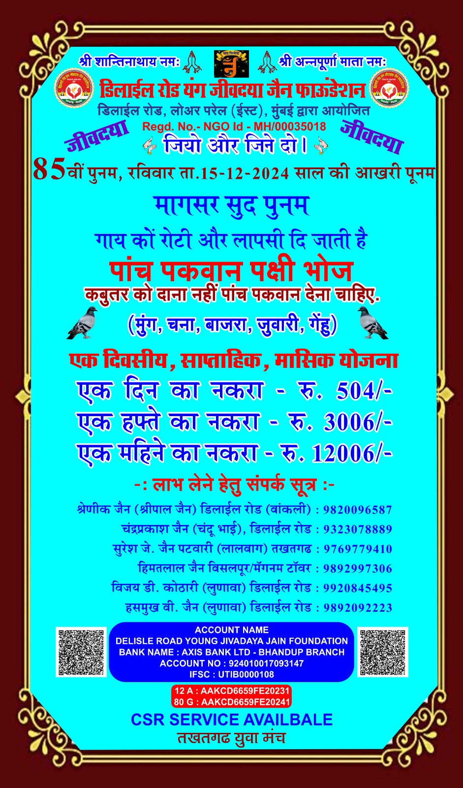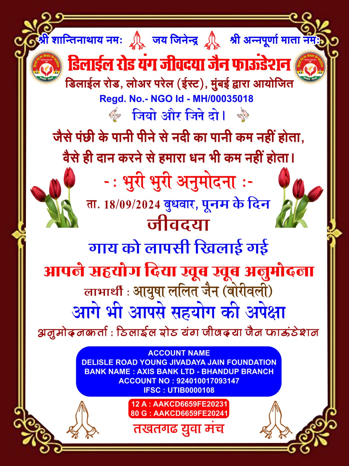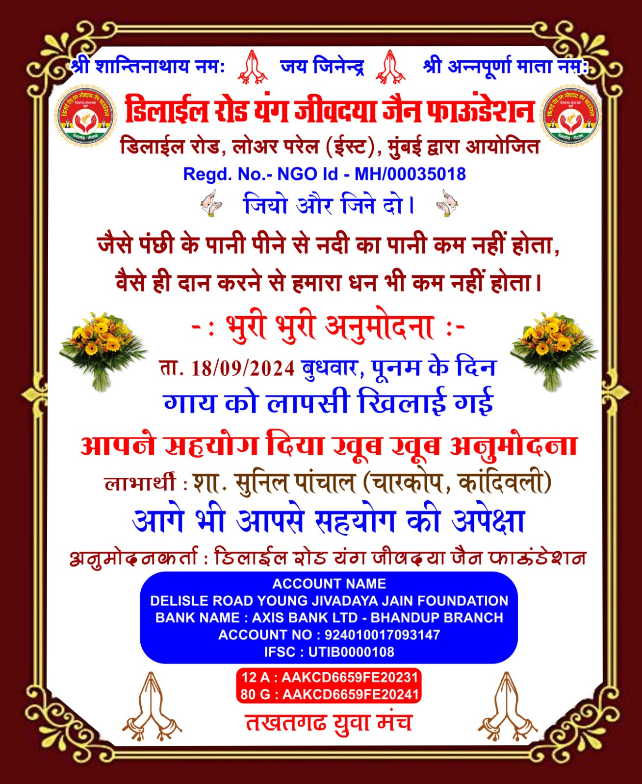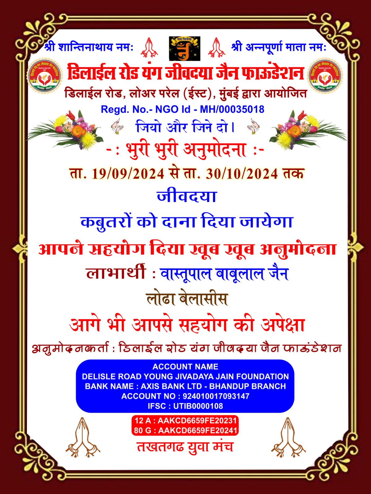 डिलाई रोड यंग जीव दया जैन फाउंडेशन और तखतगढ़ युवा मंच द्वारा संचालित जीव दया का काम 15 अगस्त 2016 से नियमित रूप से हो रहा है एवं कोरोना काल दो 20 मार्च 2019 से 15 अगस्त 2021 तक हमने 1000 लोगों के लिए सुबह दोपहर शाम चाय पानी नाश्ता एवं खाने की व्यवस्था करते रहे है एवं जरूरतमंदों ब्लाइंड हैंडिकैप्ड एवं गरीबों को खाने के किट उपलब्ध करवाते रहे हैं आज भी हमारे पास 4500 हजार ब्लाइंड्स हैंडिकैप्ड संपर्क में है इन लोगो को हर 3 महीने में खाने के कीट (राशन सामग्री) उपलब्ध करवाते रहे हैं वर्तमान में हम हर 6 माह में एक बार 50 ब्लाइंड एवं हैंडीकैप्ड लोगों को राशन की सामग्री उपलब्ध करवा रहे हैं कोरोना काल में हमारे एरिया डिलाई रोड जीव दया यंग ग्रुप में ग्रुप 7 से 8 वर्षीतप वाले थे जिनको सवेरे नारियल पानी एवं मिठाई उपलब्ध करवाते रहे हैं